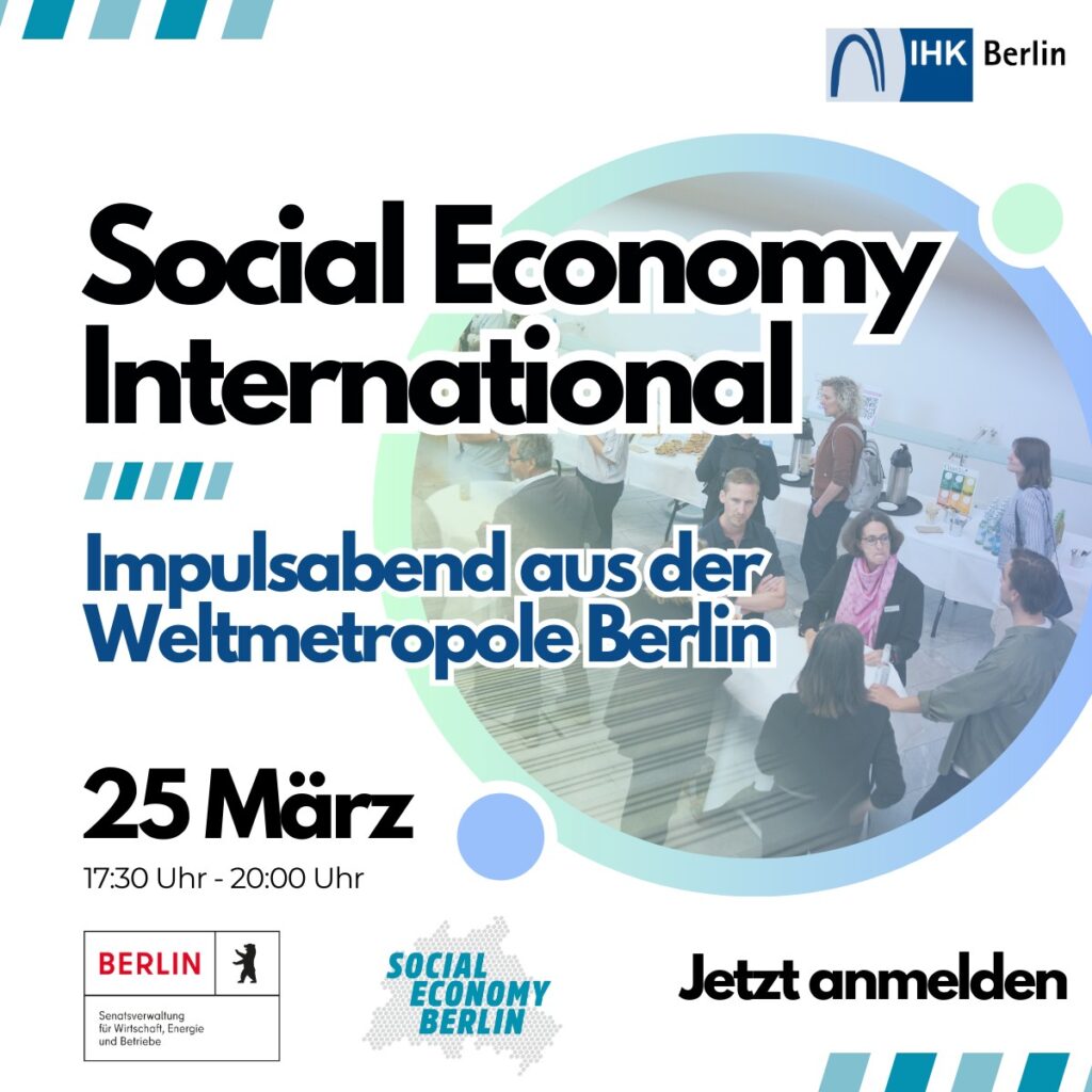 Berlin verbindet soziale Innovation, unternehmerische Stärke und europäische Perspektiven und lädt daher zum Impulsabend “Social Economy International” ein. Die Veranstaltung richtet sich an kleine und mittlere Unternehmen sowie soziale Akteur:innen, die sich für nachhaltiges, gemeinwohlorientiertes Wirtschaften interessieren und davon profitieren wollen, internationale Erfahrungen auszutauschen.